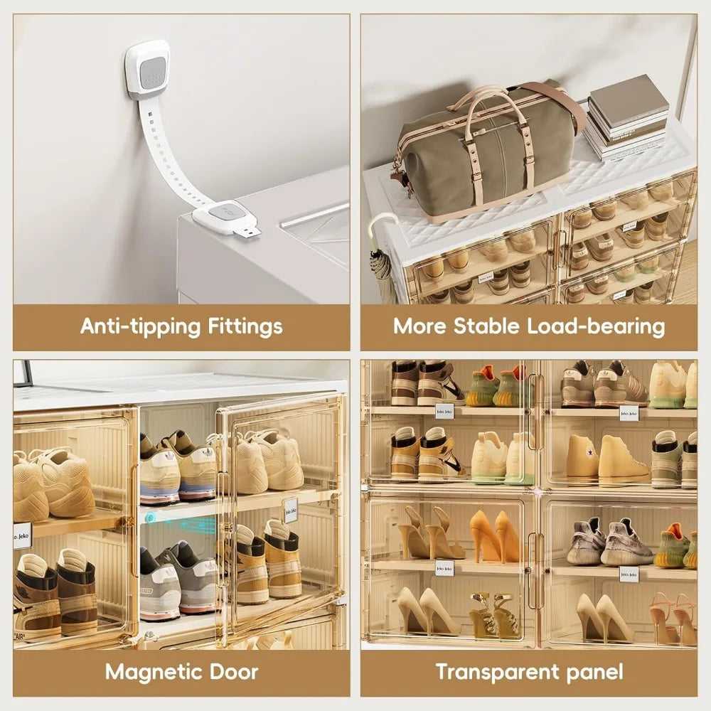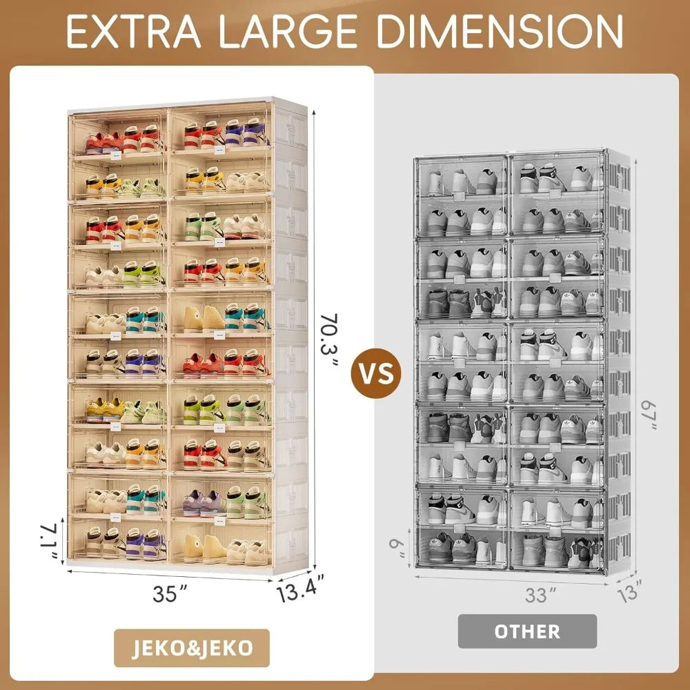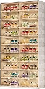 This JEKO&JEKO shoe organizer is crafted with a combination of PP and PET materials, offering a portable and foldable design for easy setup and storage. Its compact and space-saving structure is perfect for closets, entryways, or any area requiring additional organization. The shoe organizer features a transparent PET magnetic door on each box, which not only allows for quick viewing and access to your shoes but also keeps them dust-free with a strong magnetic closure for a secure and tidy appearance. Versatile in use, this free-standing shoe rack organizer can accommodate not only shoes but also accessories, toys, and other items, making it suitable for various spaces. The sturdy construction of premium PP for the cabinet body and PET for the doors ensures long-lasting durability and stability, preventing bending or breaking. With 10 tiers, this shoe cabinet can store up to 40 pairs of shoes, providing ample storage for the entire family. It also includes two anti-tipping fittings for enhanced stability, though the actual capacity may vary based on shoe size and style.