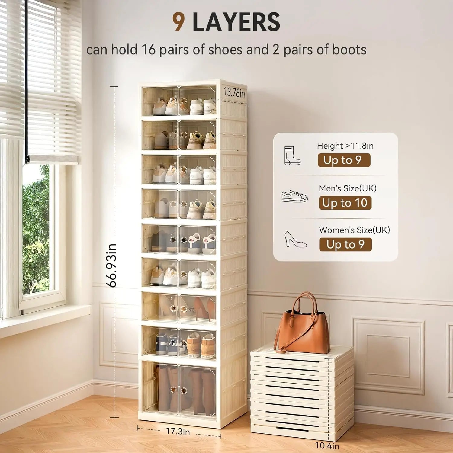 【Foldable Design】- The Expandable Size Of The Shoes Organizer:17.3''L×13.78''W×66.93''H, Including 18 Tiers(34 Grids + 2 Large Grids).This Shoe Shelf Measures Only 17.3''L X 13.7''W X 10.4''H When Folded, Very Space Saving. Shoe Storage Organizer Has A 2-Large Grids Heightened Design, Suitable For Storing Long Boots.