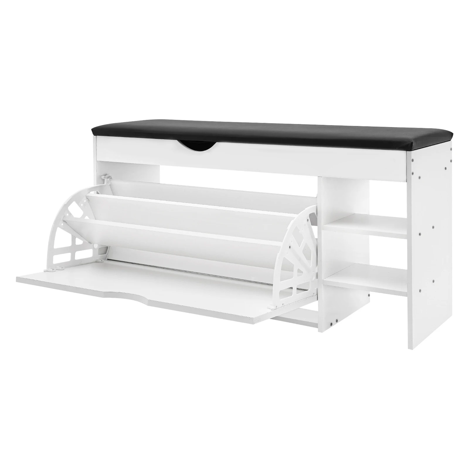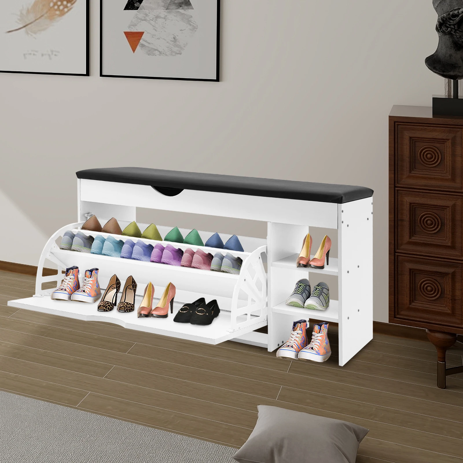 Storage Assistant:There is a 3-tier folding shoe rack on the left side, which can accommodate many pairs of shoes. On the right side is an open storage space, where you can put shoes, umbrellas, etc. for convenient access, and the small hidden drawers under the cushion allow you to store small objects, such as keys, wallets, etc.