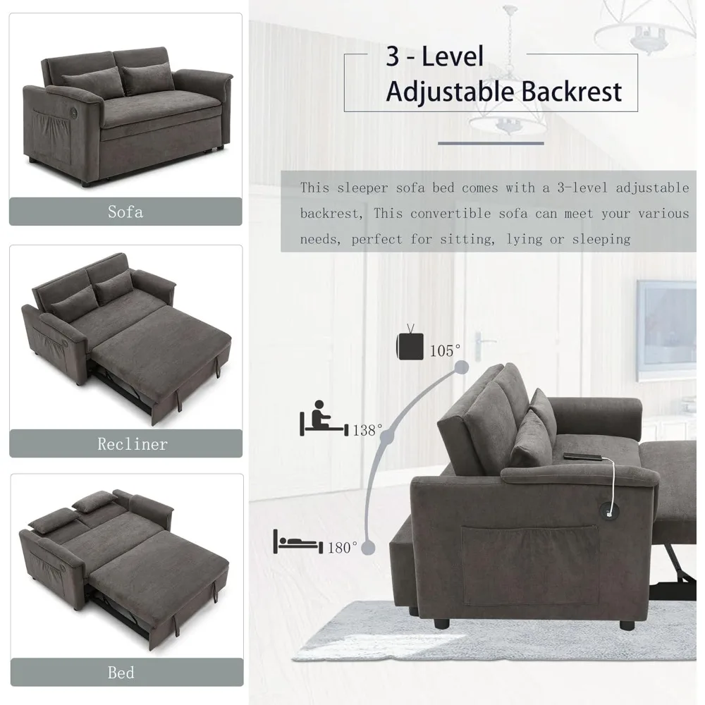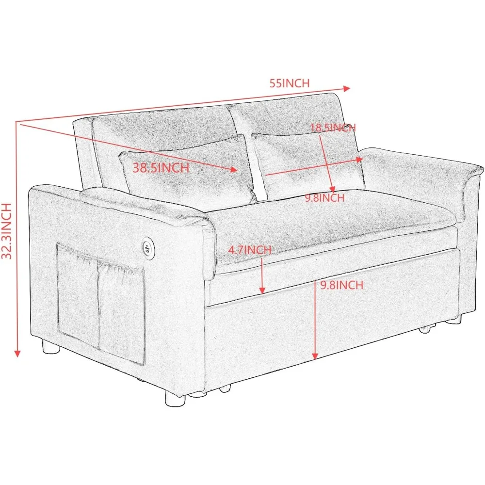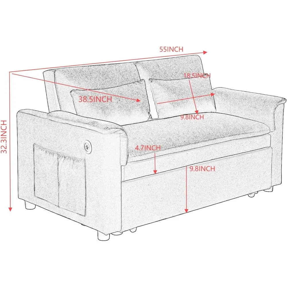 55" Velvet Two Seater Pull Out Sofa Bed, Adjustable Backrest with USB Ports, Two Side Pockets, 3 in 1 Convertible Sleeper Sofa