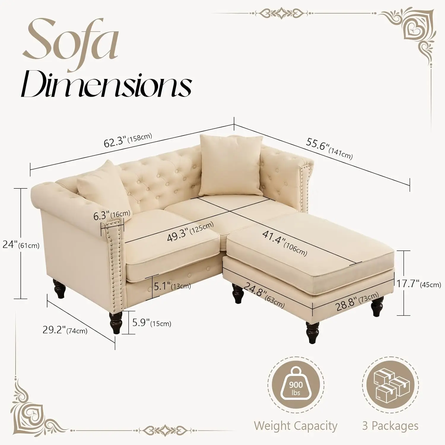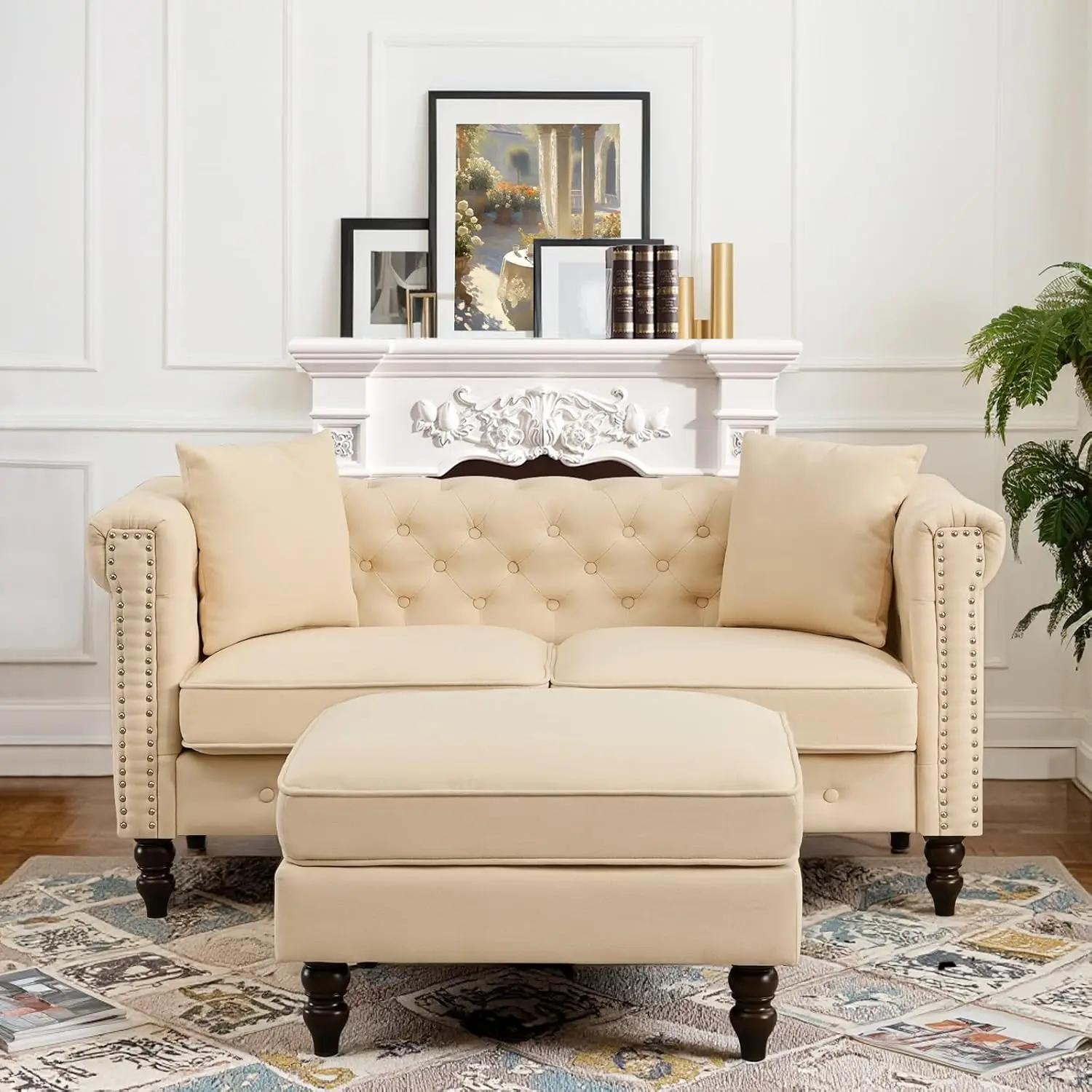 62" Chesterfield Tufted Linen Sofa Couch with Gourd Wooden Legs, Classic Loveseat Sofa Couch with Nailhead Trim and Flared