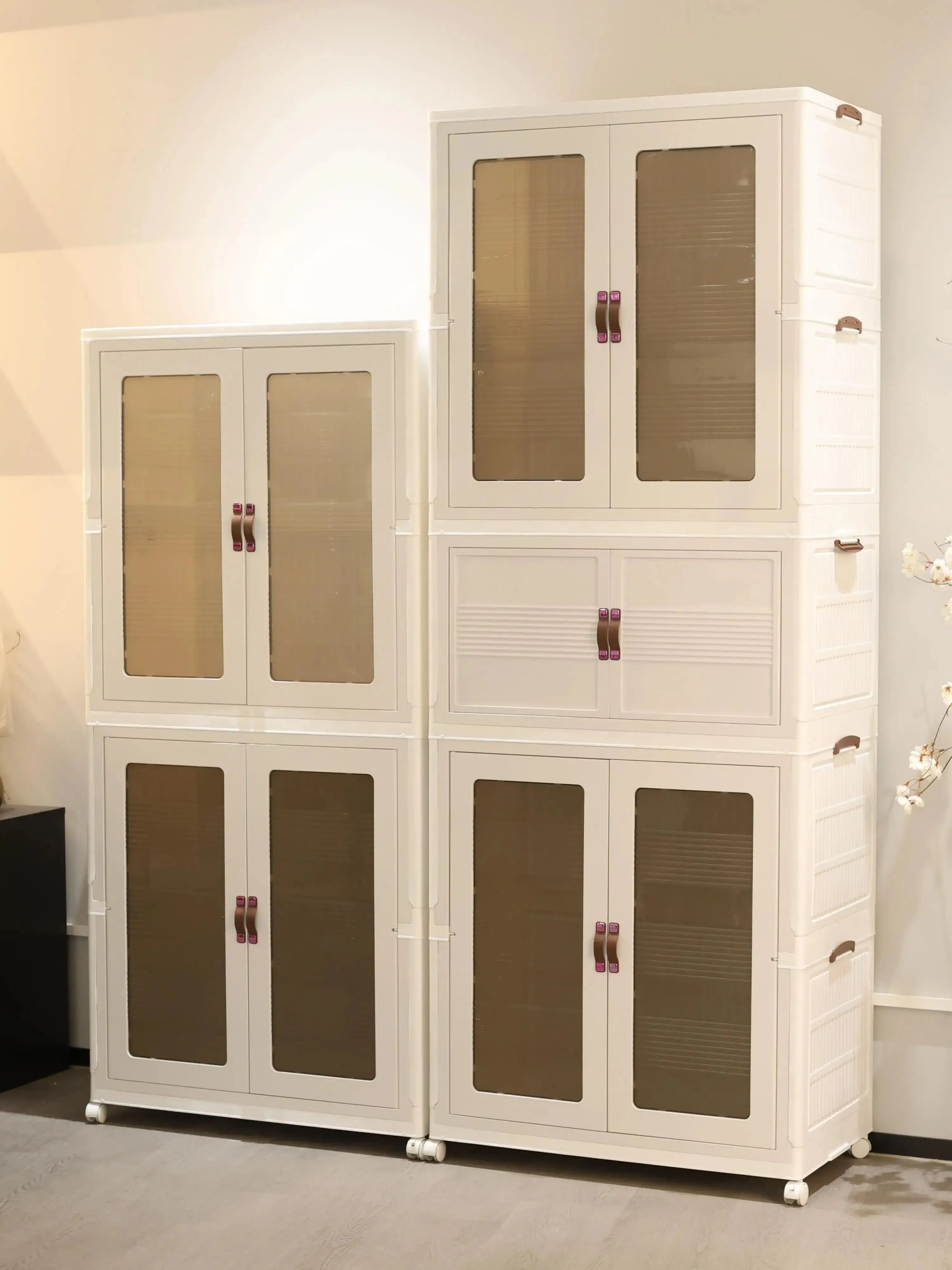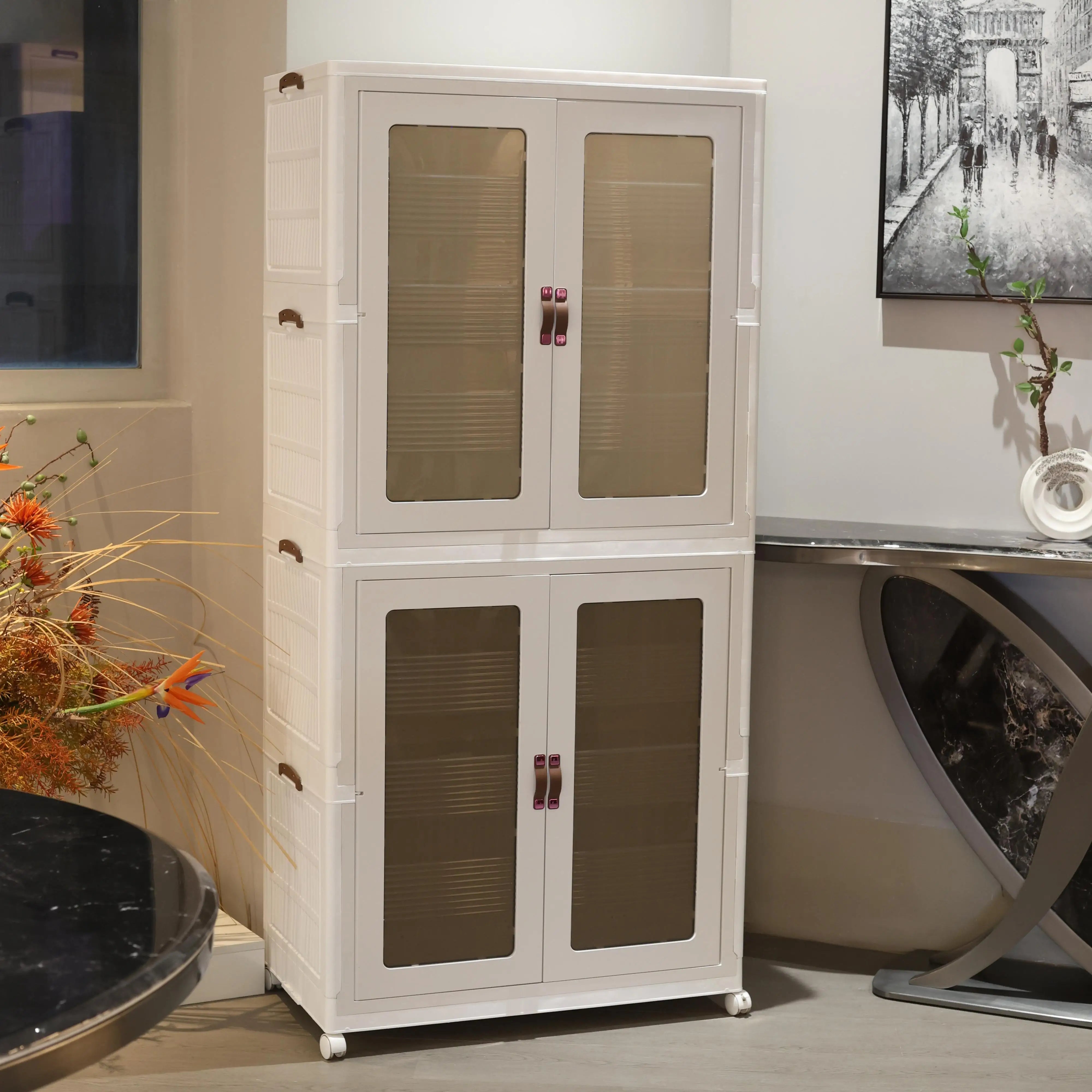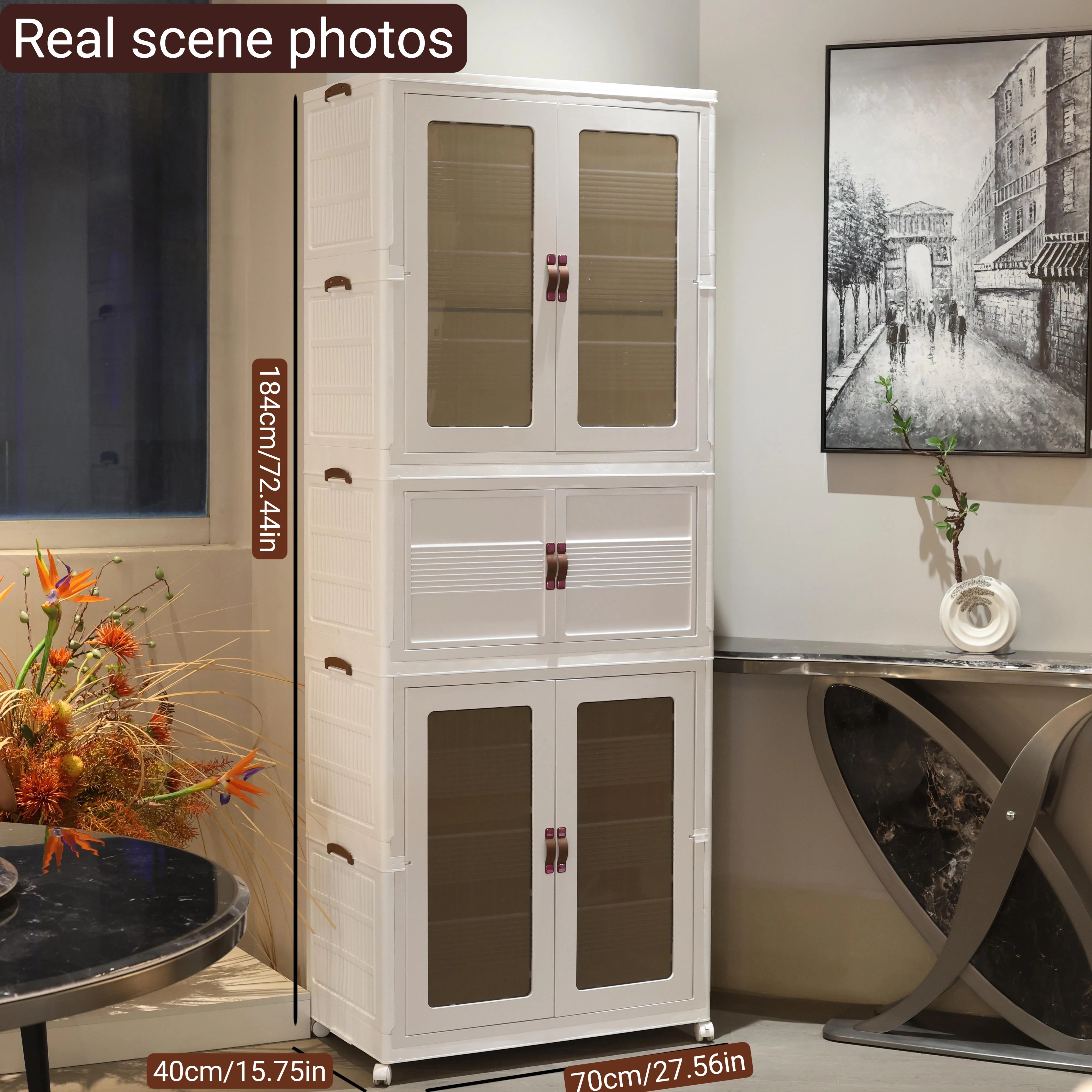 White folding storage cabinet with wheels: small and light with wheels, you can push it at home and put it wherever you want.