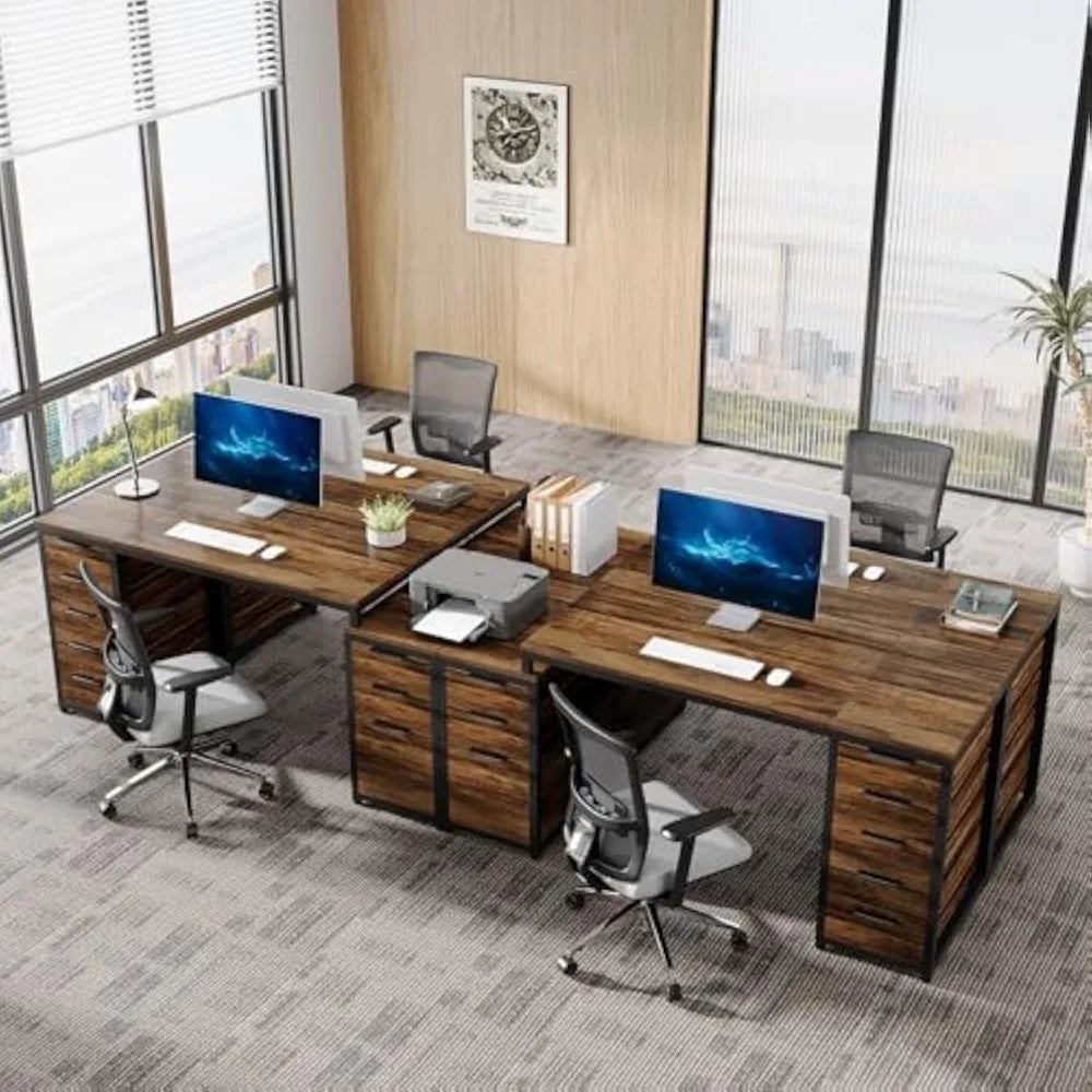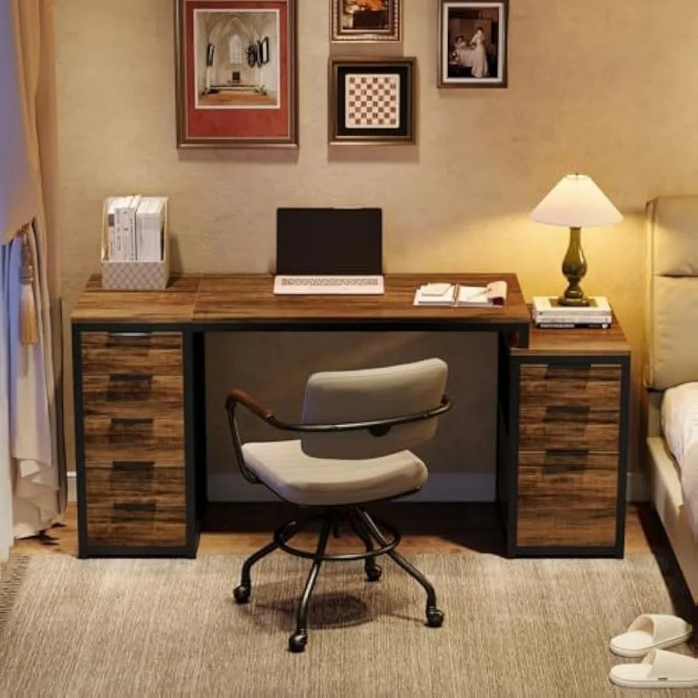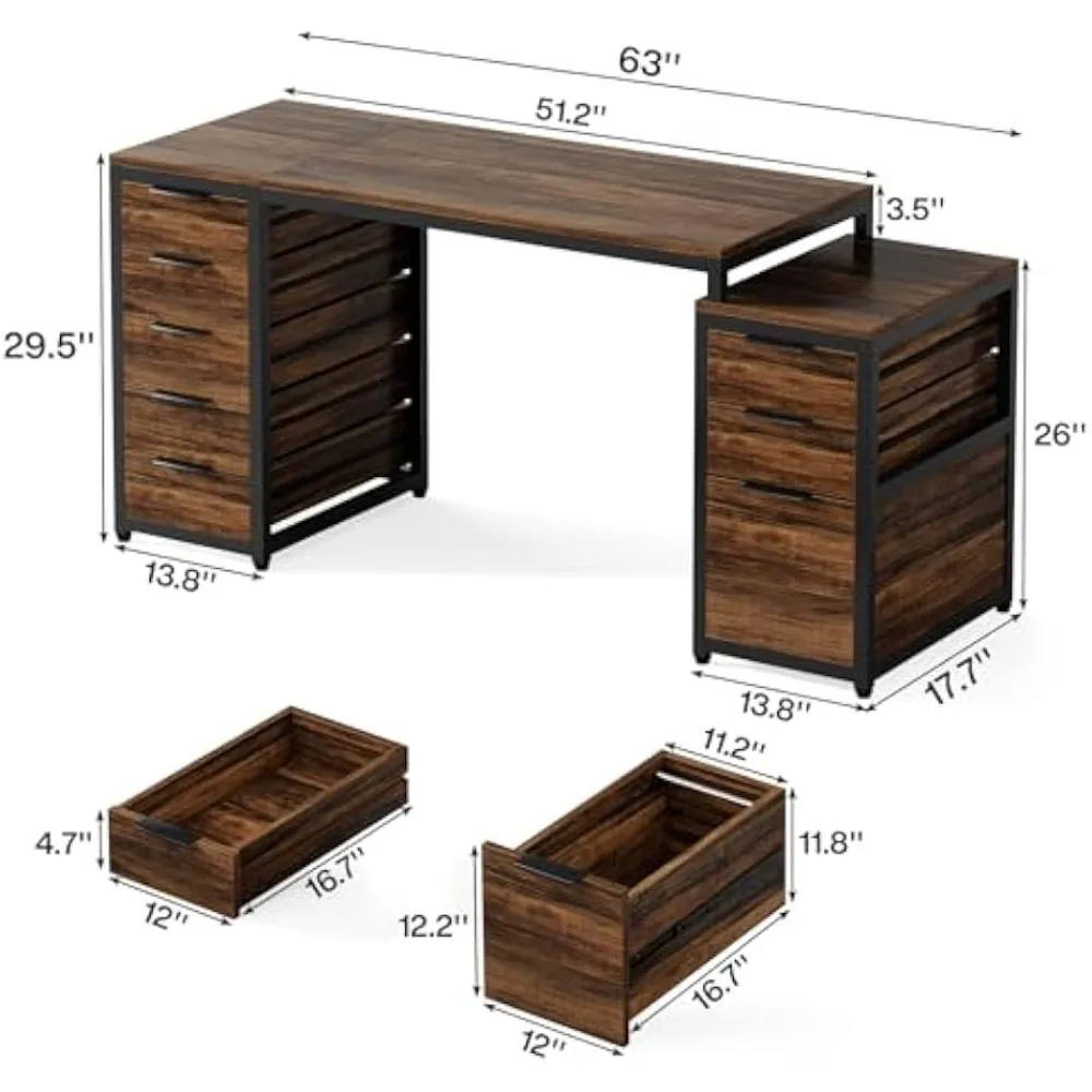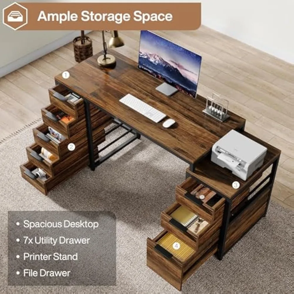 This all-in-one workstation is designed to enhance your productivity with its multifunctional computer desk. It features a large 63-inch desktop, a practical file cabinet for essential documents, seven storage drawers for office supplies, and a dedicated printer stand, making it perfect for a home office setup. The desk boasts a rustic brown finish and black metal frame, blending contemporary and vintage styles, and is suitable for various rooms as an office computer desk, gaming desk, study writing desk, or executive desk. The desk's storage capacity is exceptional, with the file cabinet able to hold letter/A4 files and the seven utility drawers providing private space for organizing goods. The cabinet is reversible, allowing for installation on either the left or right side, making it ideal for small rooms or spaces with limited area. Constructed from 0.59" engineered wood with a sprayed black-coated metal frame, this office desk offers durability, water-resistance, and anti-scratch properties, ensuring stability and longevity. Adjustable leg pads provide a sturdy construction even on uneven floors. Assembly is a breeze with step-by-step instructions and necessary hardware included. This office desk transforms your home office into an efficient and stylish space, contributing to both comfort and productivity in your work-from-home routine. We offer an 18-month warranty and 24-hour customer service for any assistance you may need.