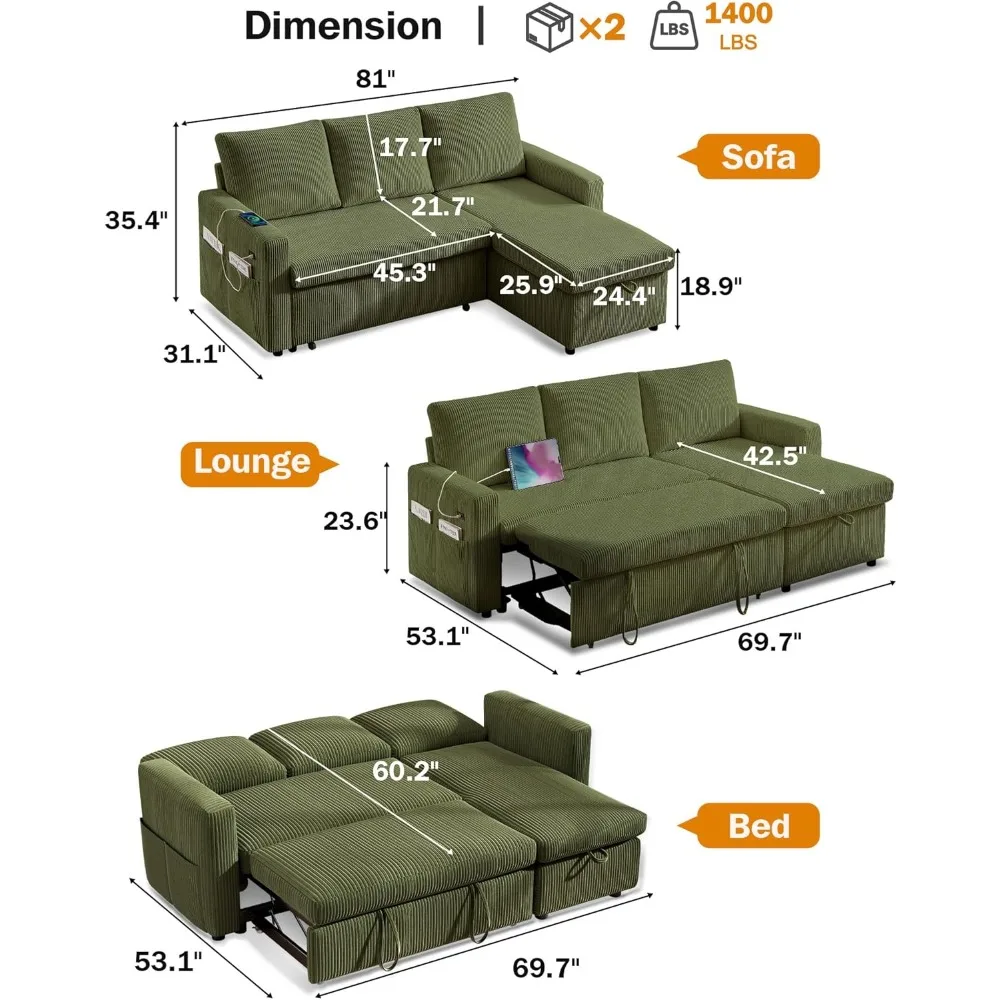 81" Sleeper Sofa Bed with Pull Out Bed, L Shaped Couch Sectional Sleeper Sofa, Pull Out Couch with Reclining Backrest,Reversible