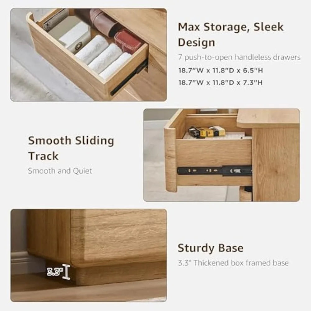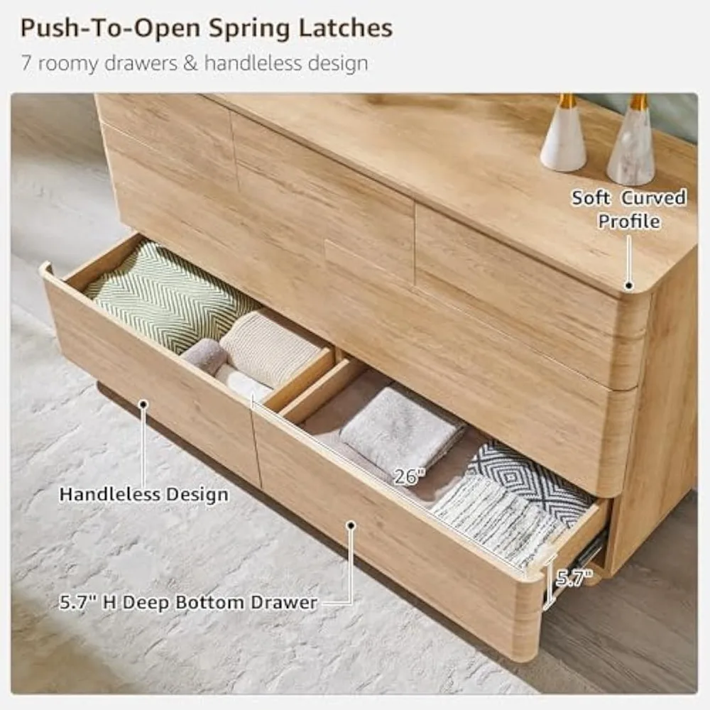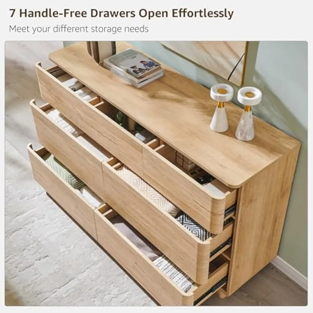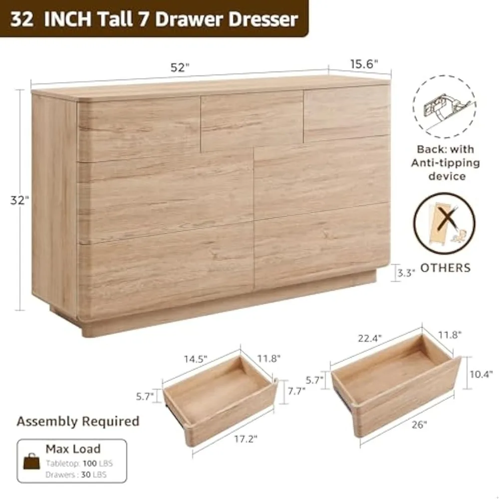 This dresser offers a sleek, modern design with curved edges, providing a stylish and safe option for any home. It features a handleless profile and smooth curves, making it perfect for families with children or pets. The dresser includes seven spacious drawers, with four large ones measuring 22.4 inches wide, 11.8 inches deep, and 5.7 inches high, and three smaller ones measuring 14.5 inches wide, 11.8 inches deep, and 5.7 inches high. These drawers open with a simple push, eliminating the need for knobs or handles. The dresser's top surface is a generous 52 inches wide and 15.6 inches deep, providing ample space for displaying decorative items or even a flat-screen TV up to 65 inches. The surface is designed with a unique wood grain finish and is both waterproof and stain-resistant, making it easy to clean. The dresser is constructed from durable, FSC-certified engineered wood, capable of supporting up to 100 pounds. It boasts a sturdy 3.3-inch base for added stability and features smooth, curved edges that are both refined and scratch-resistant. This versatile piece of furniture can be used in various rooms, such as the bedroom, living room, or hallway, and is ideal for spaces that require both storage and style. It is designed to be family-friendly and comes with clear assembly instructions and labeled parts for a stress-free setup process.