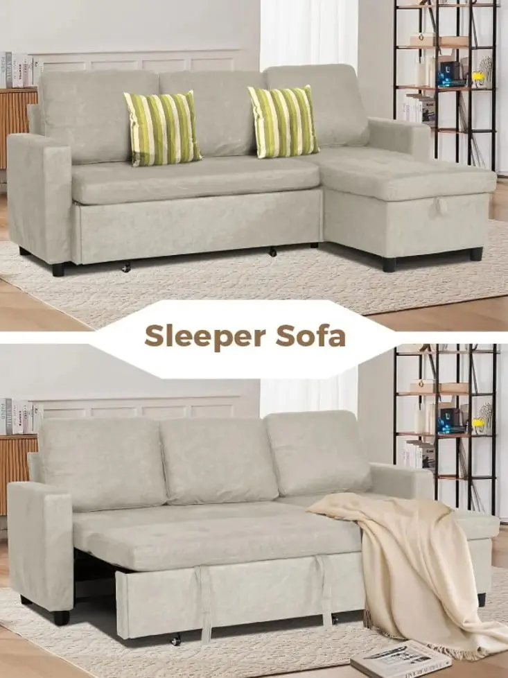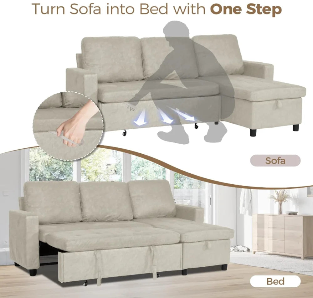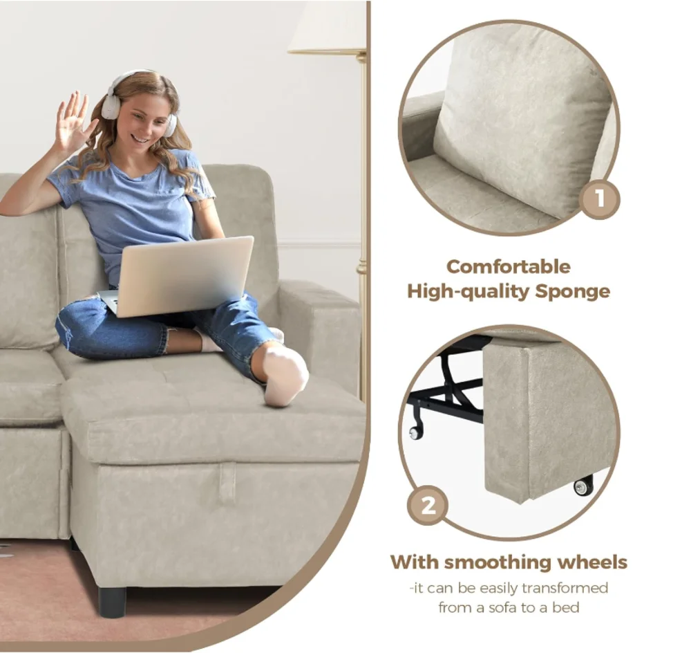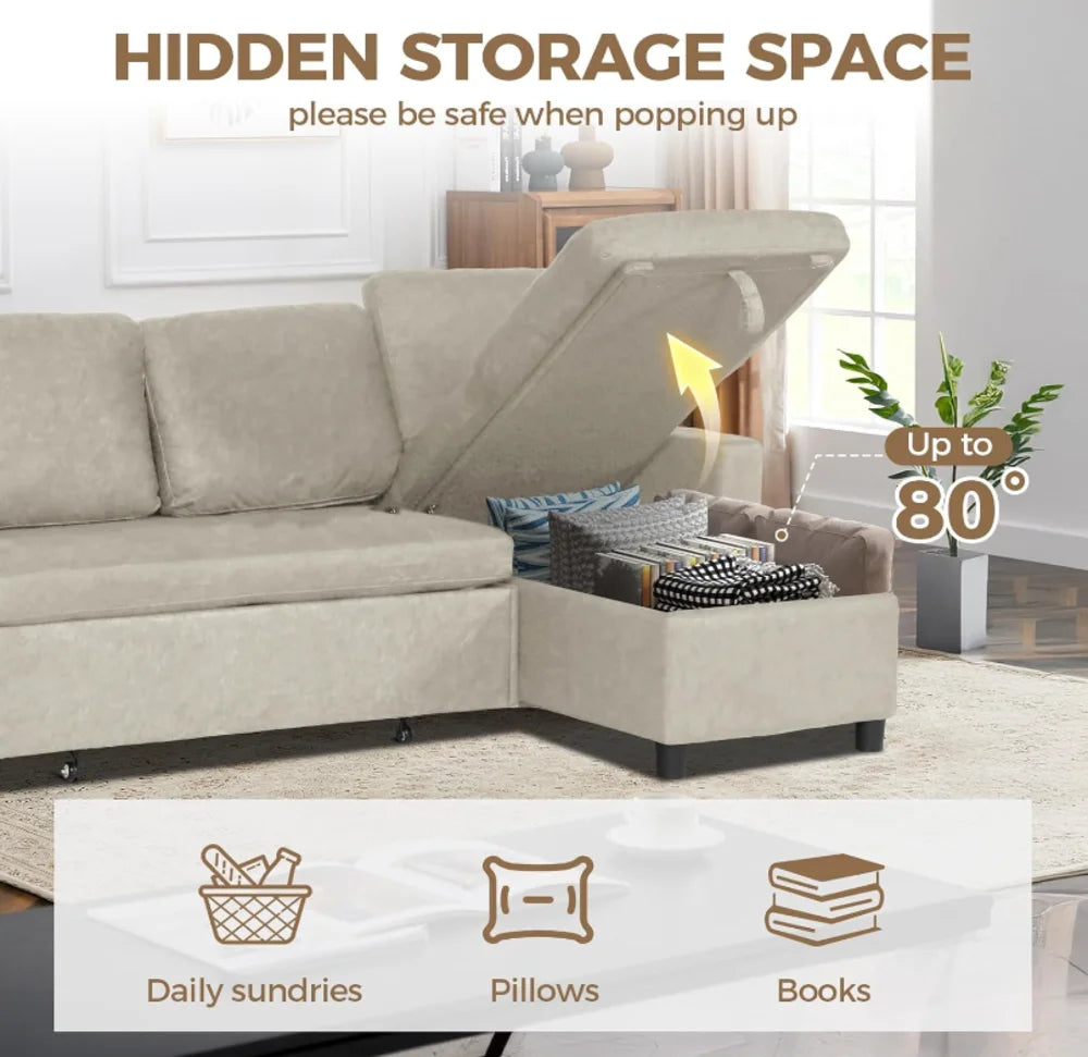 Couch with Hidden Storage: The L shaped couch with storage sleeper built-in storage is easily accessible and spacious, ideal for storing blankets, pillows, or other essentials. This thoughtful design helps save space while keeping comfort within reach, making the sofabed perfect for small spaces, living rooms or bedrooms