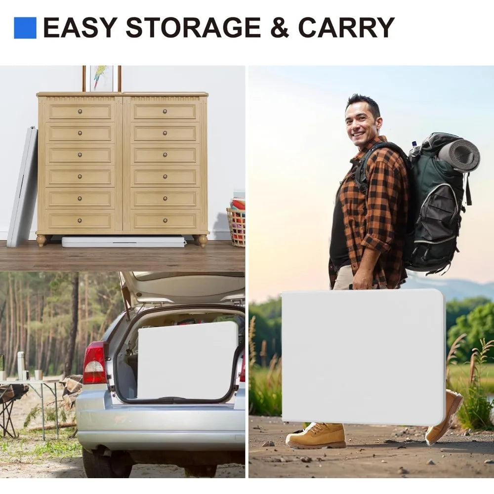 - Portable & Folding Design: The security lock allows this white folding table to be tightly locked and easily stored in small spaces such as the bottom of the cabinet, car trunk and other spaces. The foldable table with carry handle makes transport conveniently
