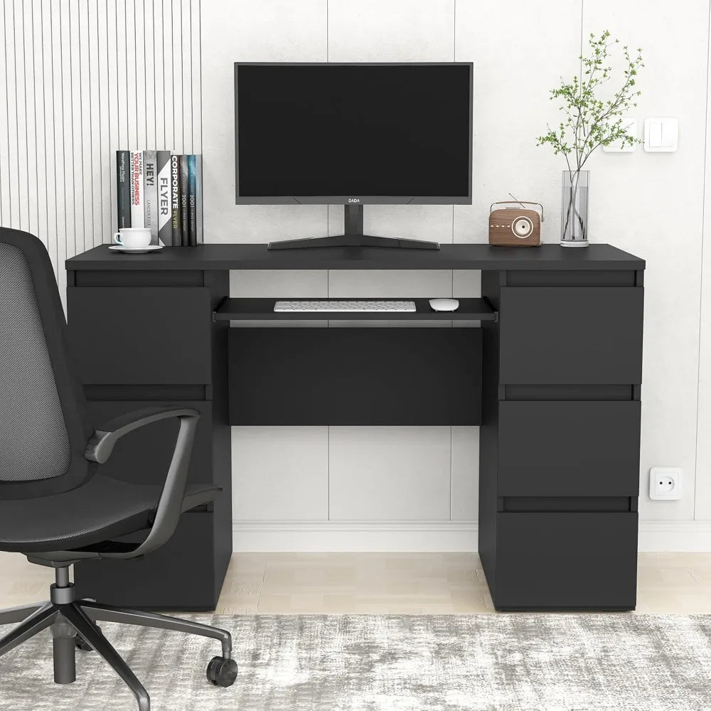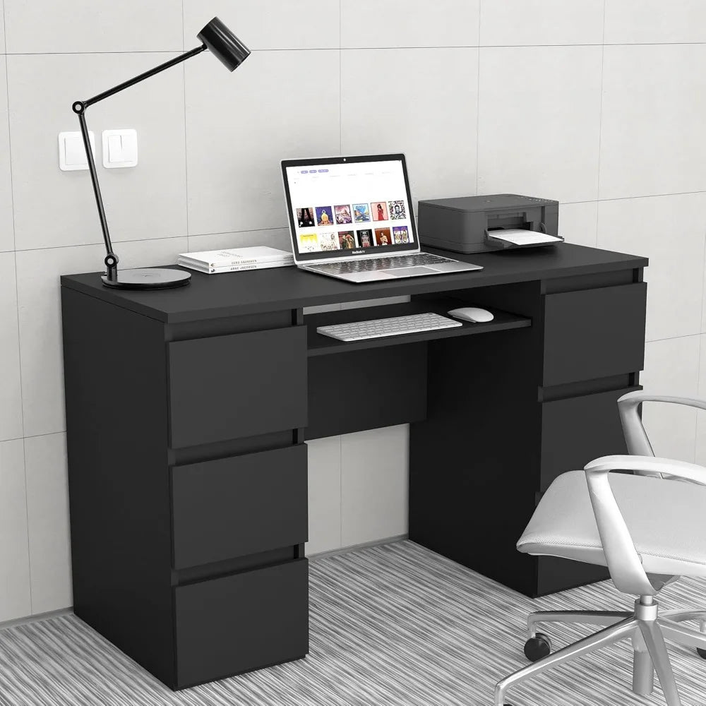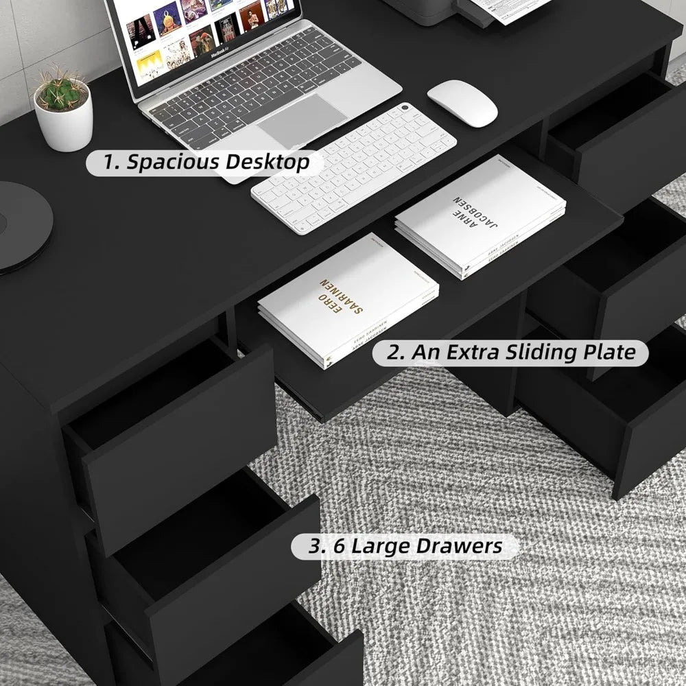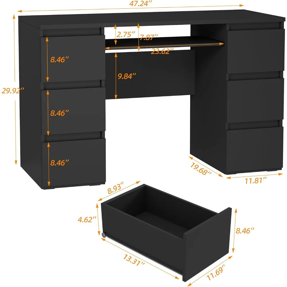 This black desk features six drawers for ample storage and a spacious 47.2 x 19.7-inch tabletop that can hold monitors, laptops, and various books. Its 30-inch height offers ample legroom. Crafted from thick particle wood board, this modern and simple desk is scratch-resistant, anti-collision, and waterproof, protecting it from daily wear. The sturdy structure includes thick engineered wood panels and strong steel brackets for stability and firmness, while the desk's bottom is designed with hard silicone legs to prevent floor damage. Versatile, this desk can serve as a computer, office, gaming, vanity, writing, study, work, or PC desk, suitable for various settings like the office, bedroom, study room, school, or living room. Assembly is straightforward with all parts and detailed instructions included, and the desk arrives in two boxes ready for assembly.
