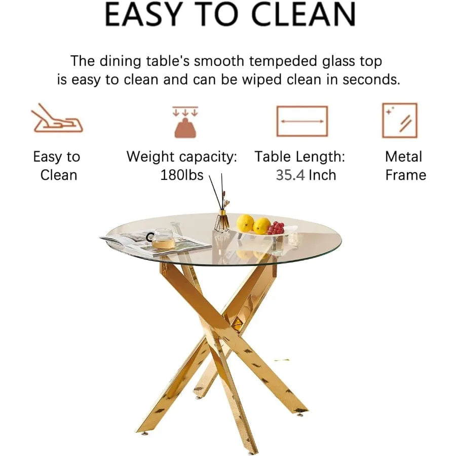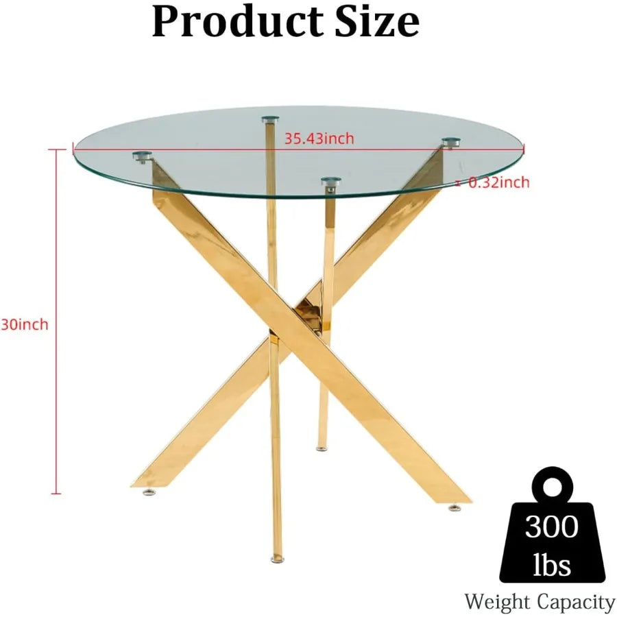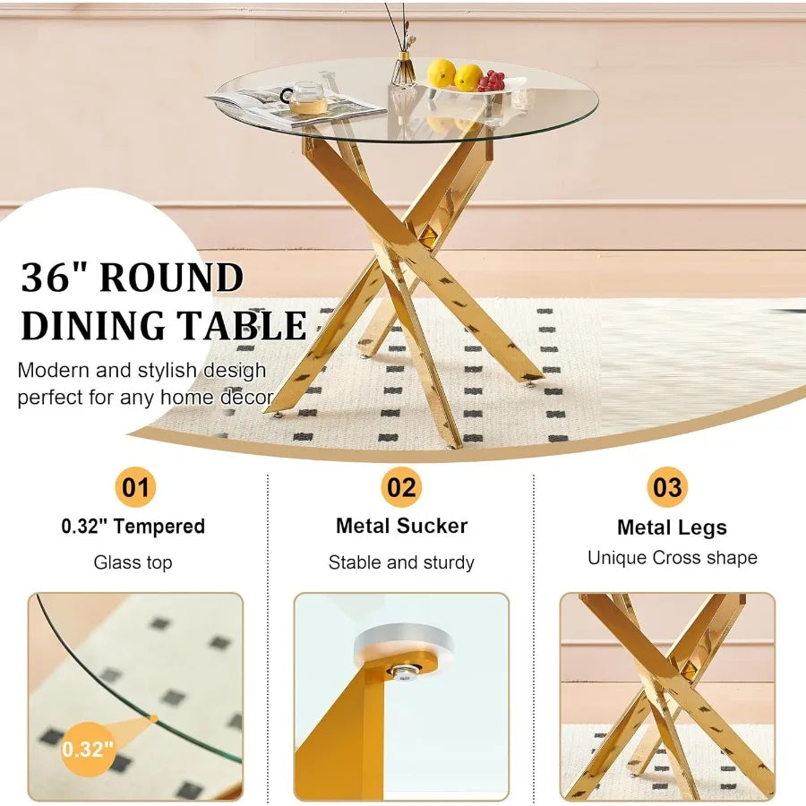 Modern Round Dining Table for 4 36 Circle Glass Kitchen Dining Room Table with Gold Metal Cross Legs Tempered Glass Tabletop Pe