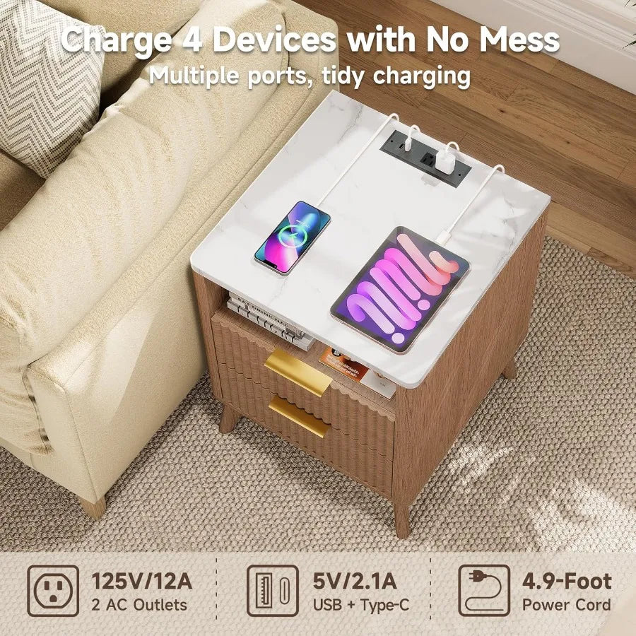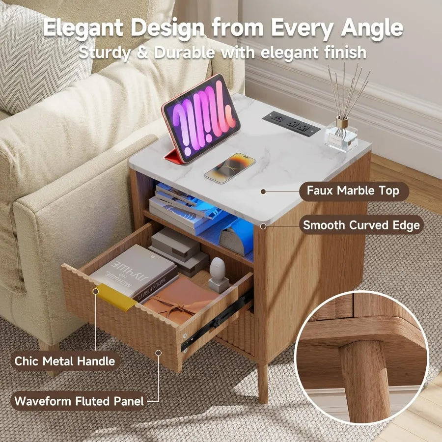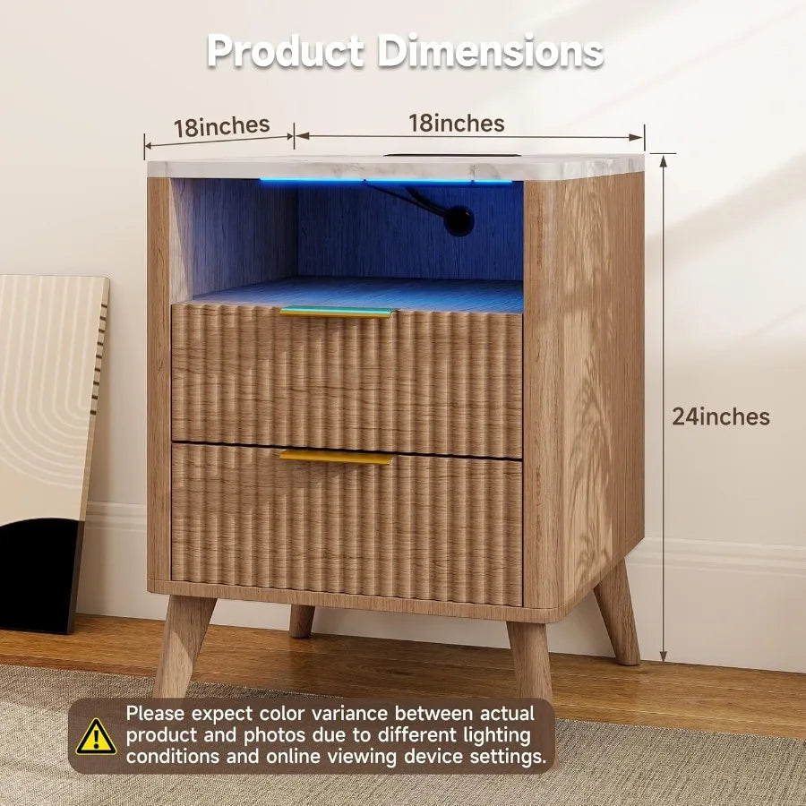 Night Stand Set of 2 18 Large Fluted LED Nightstand with Charging Station Wood Bedside Table with Faux Marble Top 2 Drawers Ope