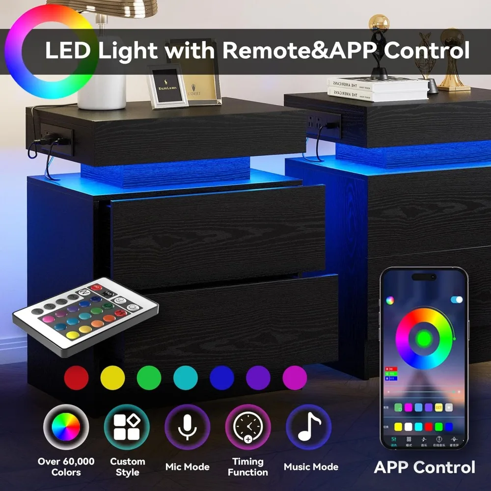 Night Stand with Charging Station, Modern Black Nightstand with LED Light and Drawers, Bedside Tables/End Table for Bedroom
