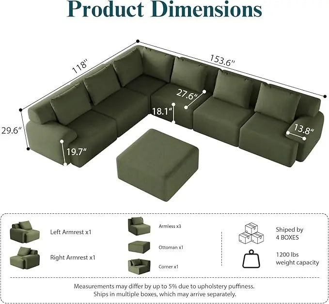 - ALL-FOAM SUPPORT, NO SQUEAKS: Crafted entirely with high-density foam and no internal wood frame, this boneless modular sofa delivers firm, quiet support that bounces back beautifully. Say goodbye to noisy springs and hello to lasting comfort