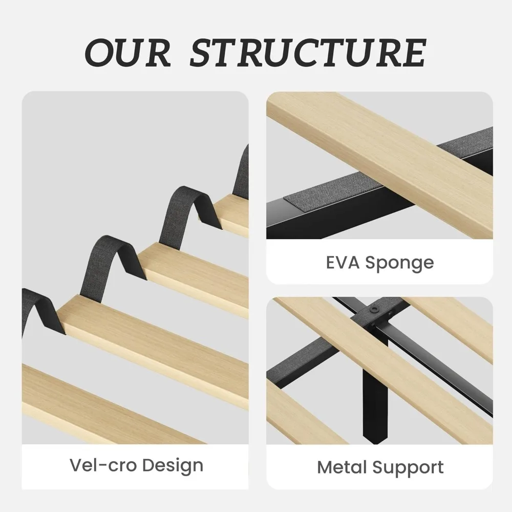 - 【Queen Bed Frame with Noise Free & No Box Spring Needed】 The slatted portion of this queen bed frame has a Velcro design that you can easily attach or detach. The entire middle of the queen size bed frame is constructed with a metal support system, which greatly enhances its stability. At the same time, the metal support beam in the middle of this queen size bed frame with headboard is equipped with EVA sponge, which reduces the squeaks that may occur during use and makes it as noise-free as possible. The overall structure of this queen bed frame with headboard already provides enough support to be used straight away and there is no box spring needed