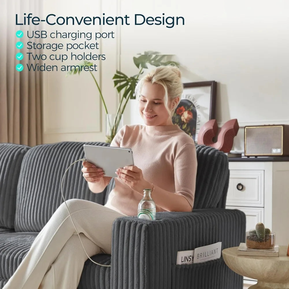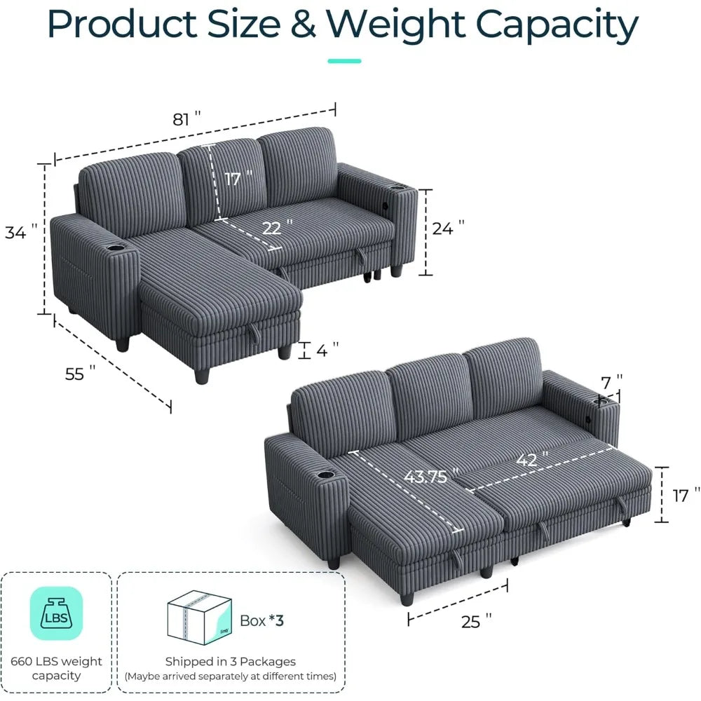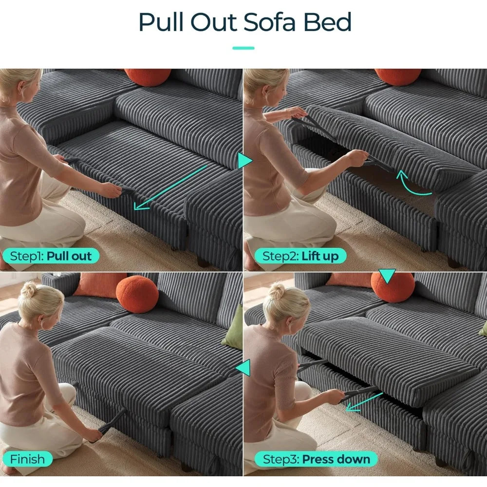 Sectional Sleeper Sofa with Pull Out Couch Bed Convertible Plush Corduroy Cloud Couch with Storage Chaise & USB Charging, Comfy