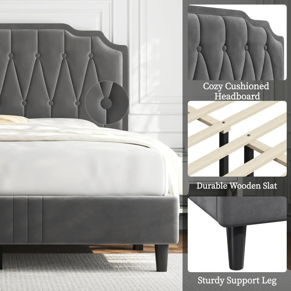 Velvet-Covered Platform Bed with Curved Headboard - Height Adjustable and Noiseless Wooden Bed Frame