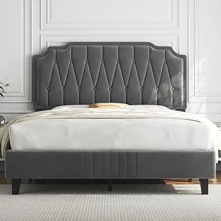 This item features a stylish bed with a velvet fabric cover that complements a solid wooden frame, making it versatile for various decor styles. You can choose to make it a subtle part of your room or a standout piece. The headboard is designed to be adjustable, offering two height options to fit mattresses of different thicknesses by simply adjusting the pre-drilled legs. The bed's frame is built to last with 12 sturdy wooden slats that enhance the bed's durability and strength. These slats are spaced between 3.7 to 3.9 inches apart, ensuring even weight distribution across the entire bed. The bed also offers a practical 6-inch clearance under the frame, which is perfect for vacuum cleaner robots to move through with ease, simplifying the cleaning process. There's no need for a box spring with this bed. After assembling the frame, you can directly place your preferred mattress—be it latex, foam, or spring—on the wooden slats, and you're ready to enjoy a comfortable sleep.