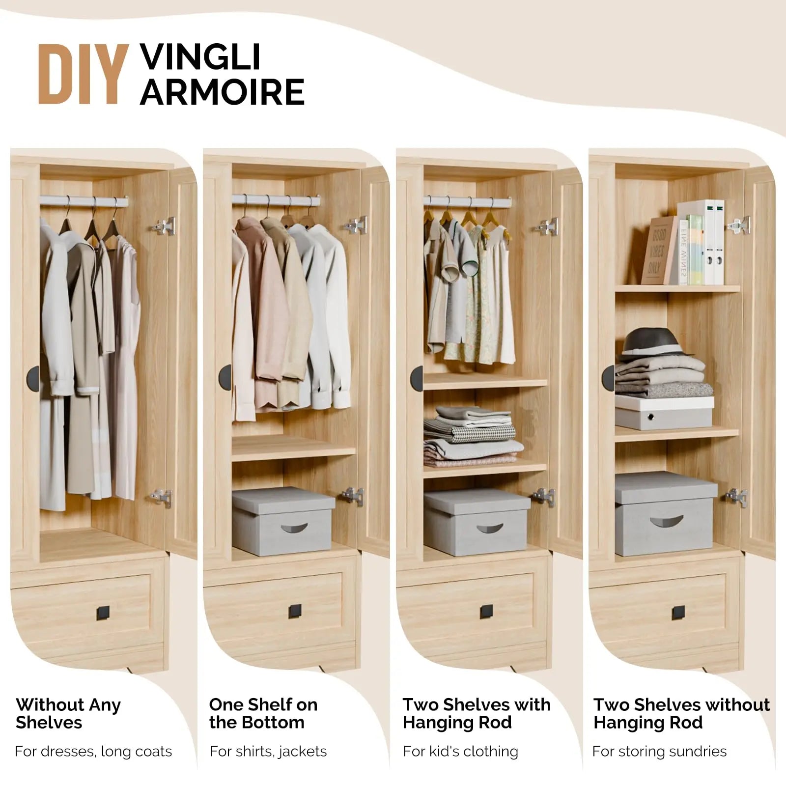 【Customizable Interior Storage】The internal space of the wardrobe closet is designed for customization. Divided into two sections, it features 2 removable hanging rods and 2 adjustable shelves, allowing you to optimize your wardrobe's interior space for different garment lengths.